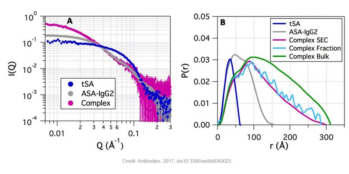 Fig. 1. ASA-IgG2, tSA和ASA-IgG2–tSA复合物在pH 6.5时的SAXS数据。(A)复合物及其组成部分的SAXS分布显示复合物在低Q时强度更高,其次是ASA-IgG2和tSA(SEC-SAXS)。(B)ASA-IgG2–tSA复合物及其组成部分的对分布函数P(r)。Credit: images extracted from Antibodies. 2017, doi10.3390/antib6040025.